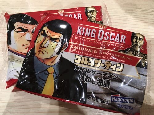 オイルサーディンの棚にふと目を向けると…な、な、なんと眼光鋭いゴルゴ13が! Umm…ゴルゴサーディン... ポーランド製 はごろもフーズ販売